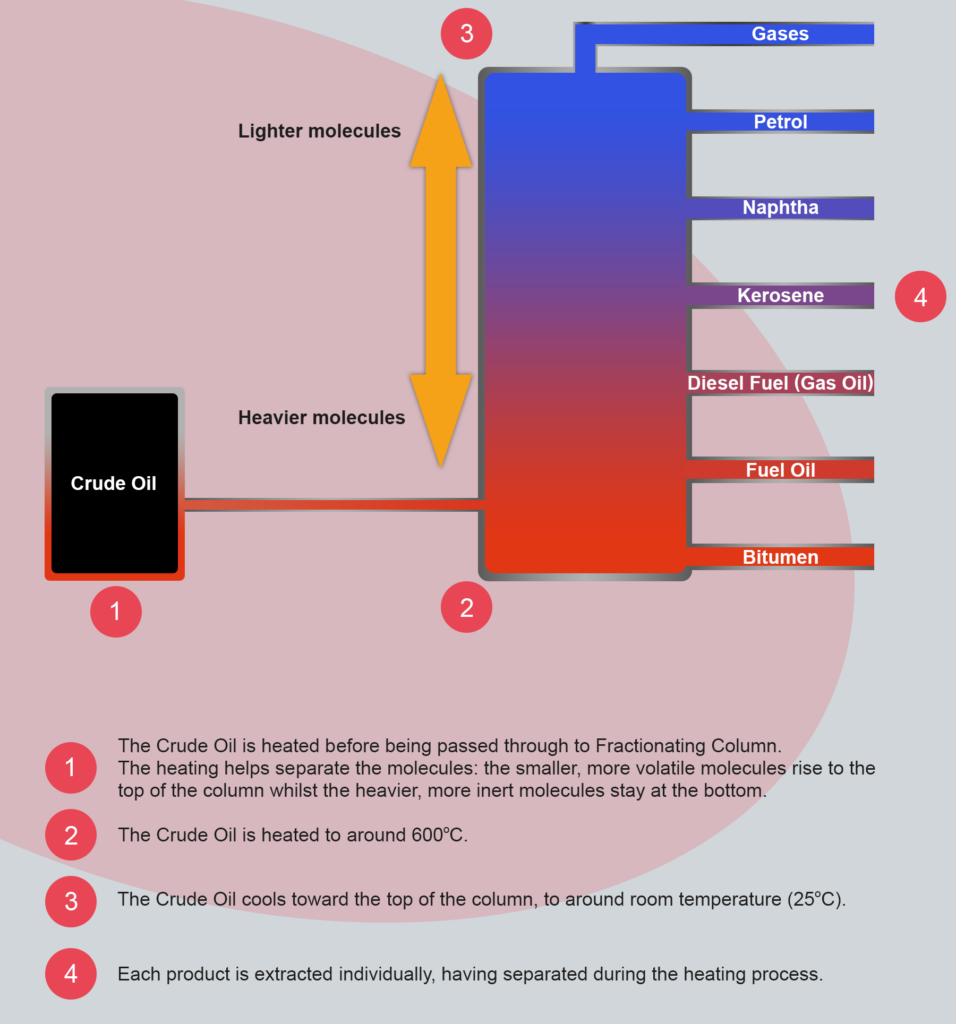 The process of fractional distillation is a way in which a range of fuels, lubricants and oils are extracted from crude oil. These fuels, oils and lubricants are created to help power our diesel road vehicles, and machinery as well as keep homes and workspaces heated.
