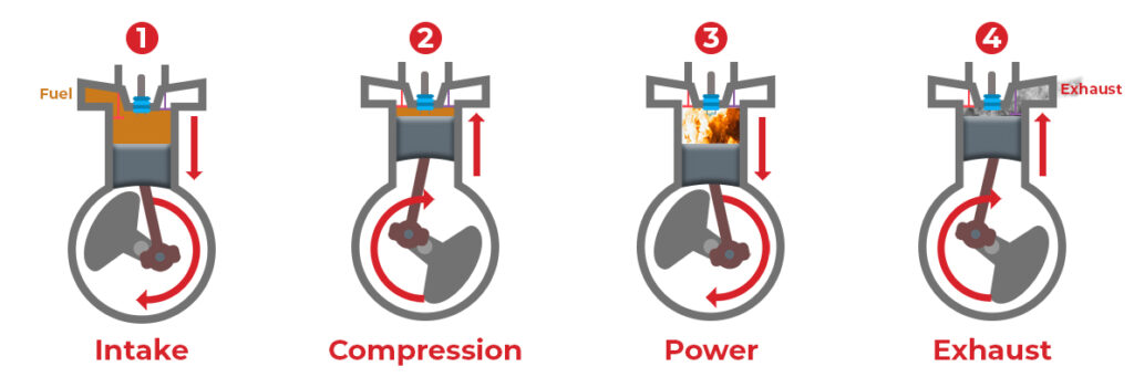 Exhaust stroke – Additional combustion gases are then forced out of the exhaust fuel, through the exhaust manifold and into your exhaust.
